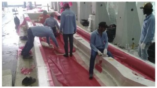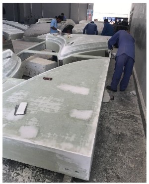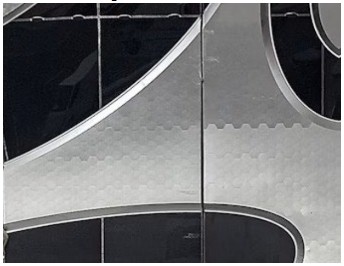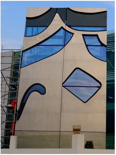 5. The shape of the building, in particular the curvature, and the calligraphy means that each panel making up the façade is unique. The panels are composite in construction using Glass Fibre Reinforced Polymer (“GFRP”) with infill double-glazed units in the shape of the calligraphy. The outer finished surface is stainless steel polished, patterned, vacuum-bonded, and mechanically fixed to the panels’ outer surfaces and external reveals.